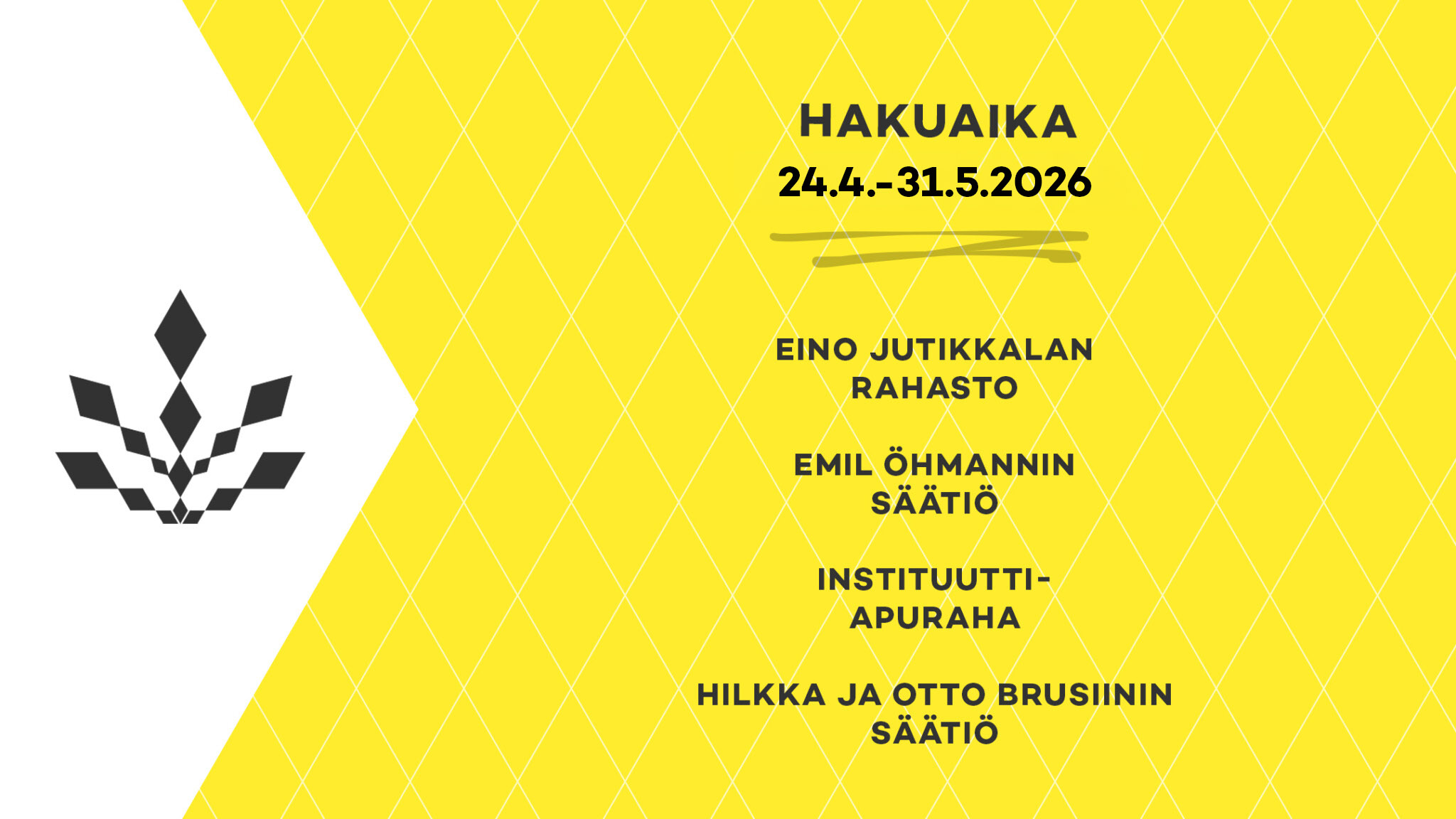 Eino Jutikkalan rahasto myöntää apurahoja humanistisen tutkimuksen tohtoriopintoihin. Vuonna 2026 hakualoina ovat arkeologia, historia, oikeustieteet ja yhteiskuntatieteet. Apurahaa voi hakea, jos jokin hakualoista on tutkimuksen keskeinen ala. Hakijoita rohkaistaan monialaisuuteen.