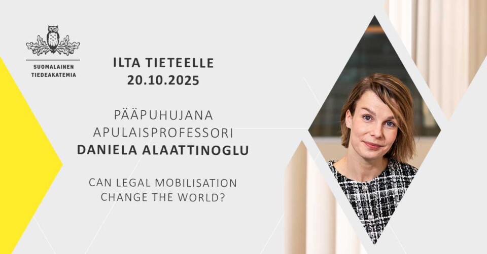 Suomalaisen Tiedeakatemian Ilta tieteelle -yleisötilaisuus järjestetään maanantaina 20.10. Ritarihuoneella Helsingissä. Illan pääpuhujana on oikeustieteen apulaisprofessori, Nils Klim -palkittu Daniela Alaattinoglu. Ilmoittaudu mukaan!