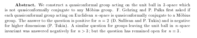 Ghamsari, Manouchehr: Quasiconformal groups acting on B^3 that are not quasiconformally conjugate to Möbius groups, pp. 245-250.