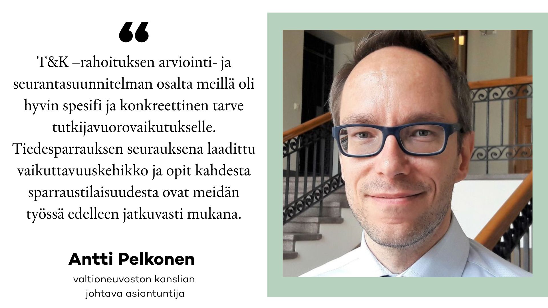 Valtioneuvoston kanslian johtavan asiantuntijan Antti Pelkosen mukaan Tiedesparrauksessa välitetty tieto tuki hyvin konkreettisesti suunnitelman valmistelua. Arviointi- ja seurantasuunnitelmaan kehitettiin tiedesparrauksen seurauksena esimerkiksi vaikuttavuuskehikko eli jäsennys ja lähestymistapa vaikuttavuuden ymmärtämiseen ja arviointiin. Siten sparraustiedon vaikutus näkyy aina, kun asioita viedään valmistelun mukaisesti eteenpäin ja vaikuttavuuskehikkoa käytetään.